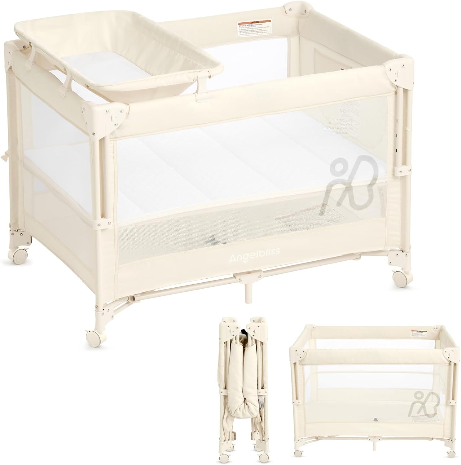 ANGELBLISS Baby Bassinet Bedside Crib, Pack and Play with Mattress, Diaper Changer, One-Push Setup Playards from Infants to Toddlers (Balck)
