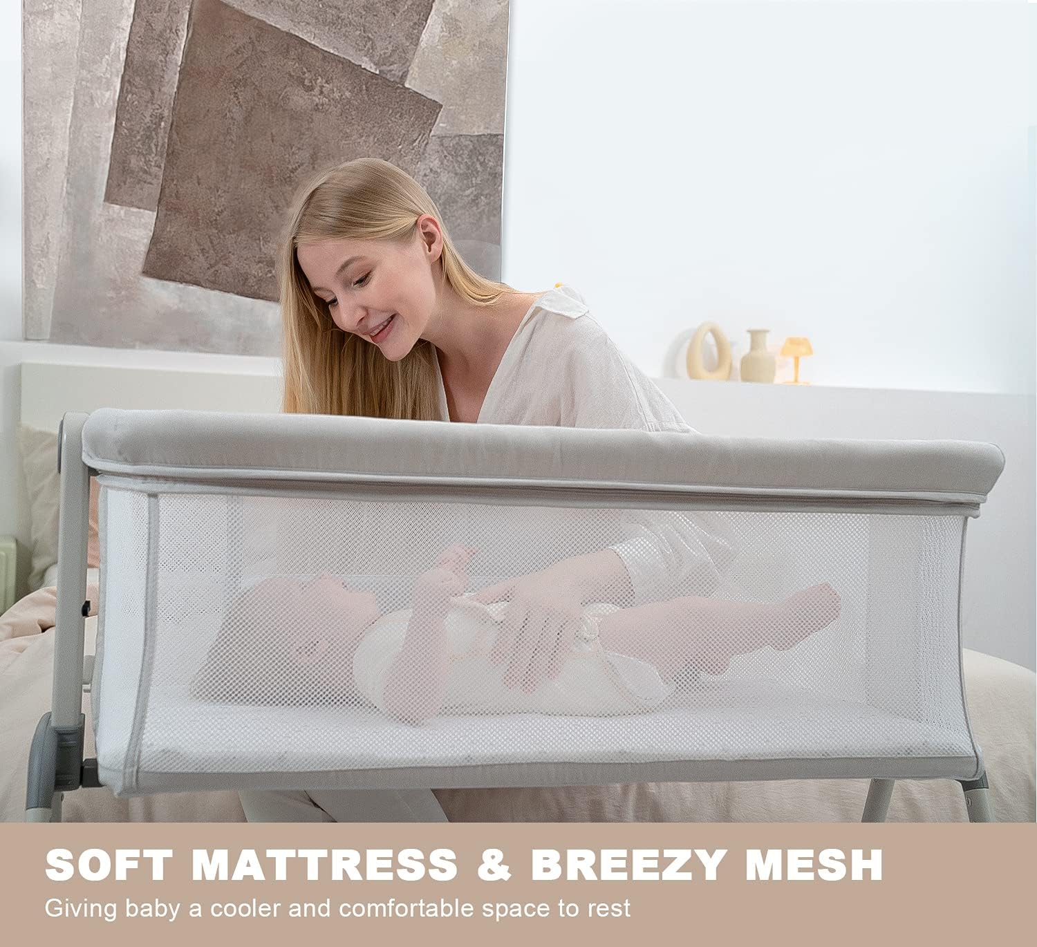 ANGELBLISS Baby Bassinet Bedside Sleeper, Easy Folding Portable Bassinet for Baby with Wheels, Adjustable Height, Included Mattress (Beige)