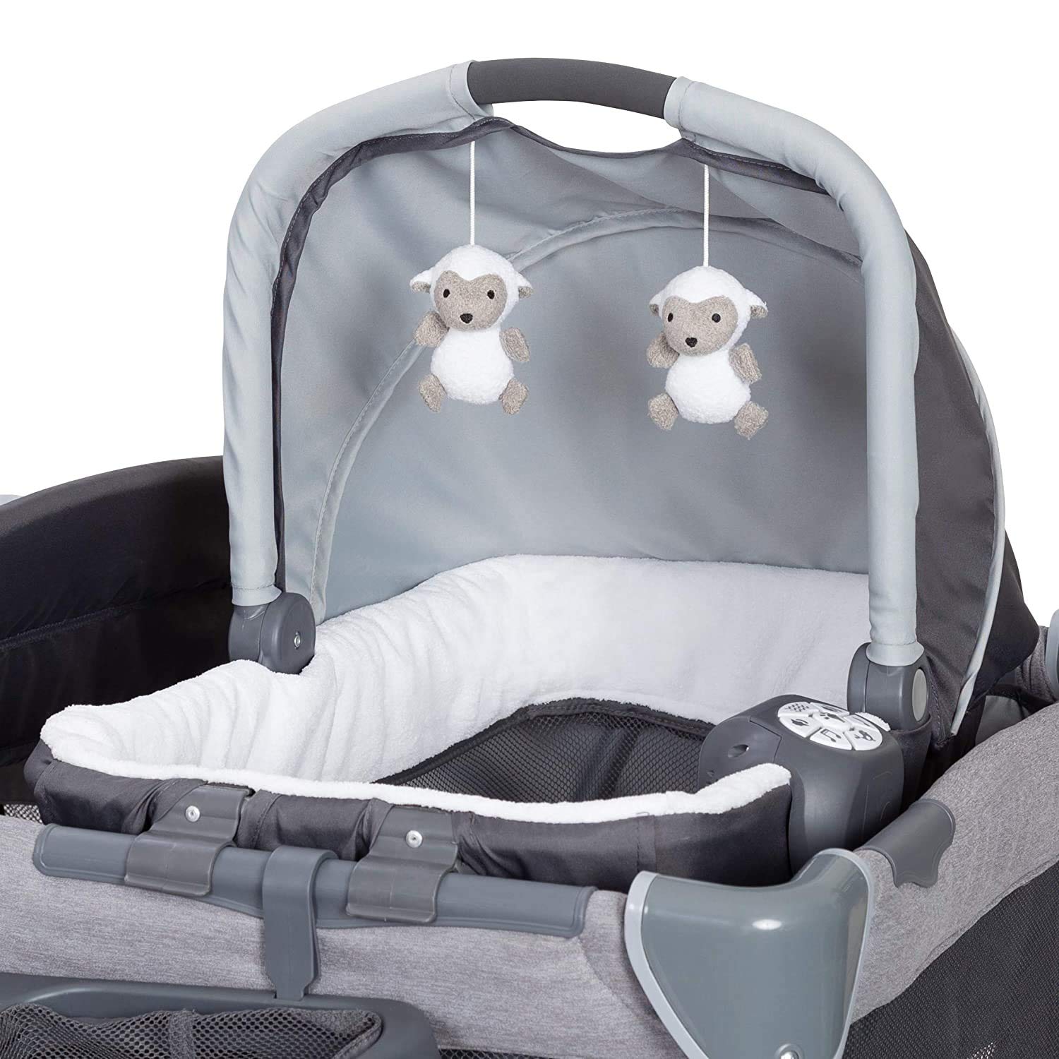 The Baby Trend Retreat Nursery Center features a Removable Rock-A-Bye Bassinet with a canopy and carry handle, plush fabric and mesh sides for proper ventilation, and 2 toys.