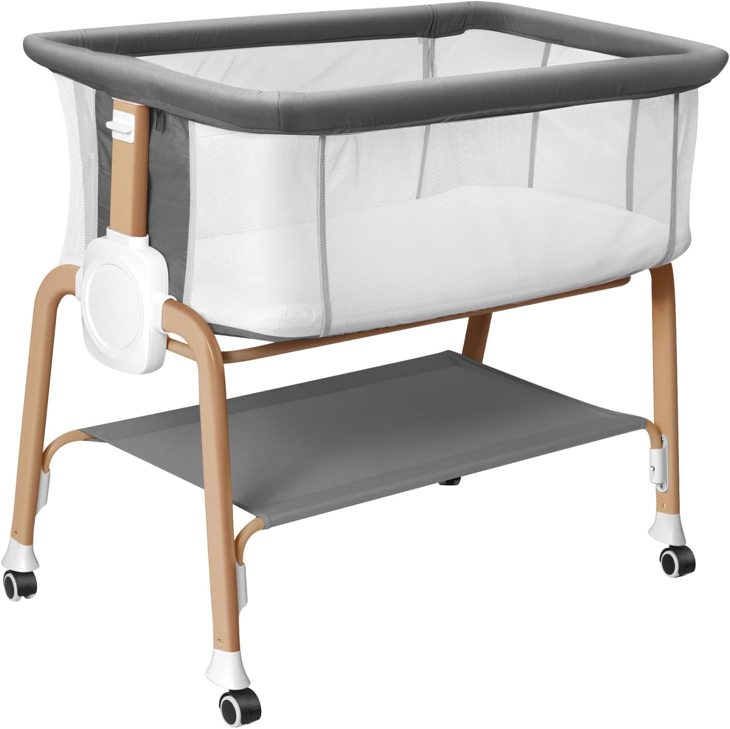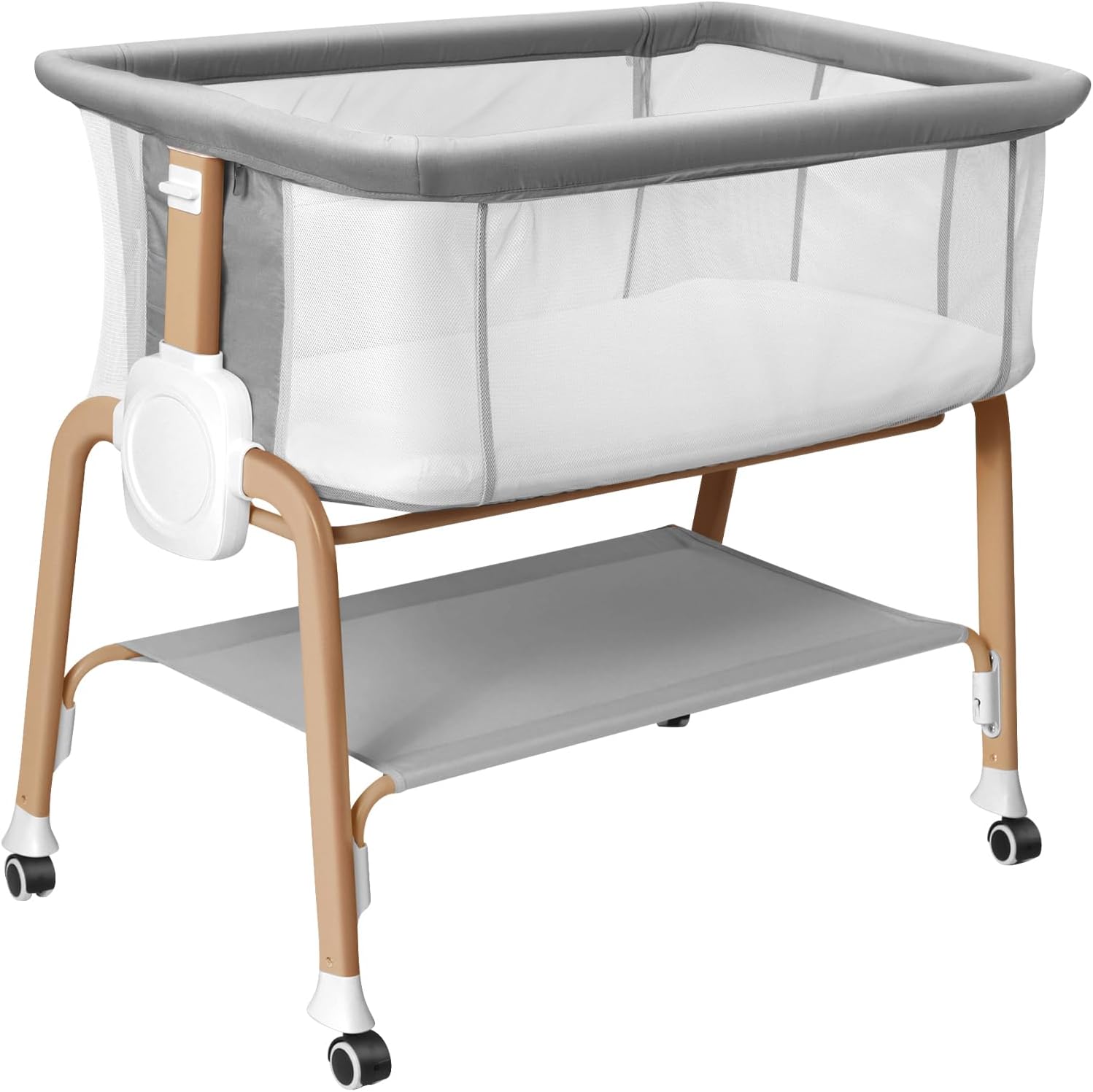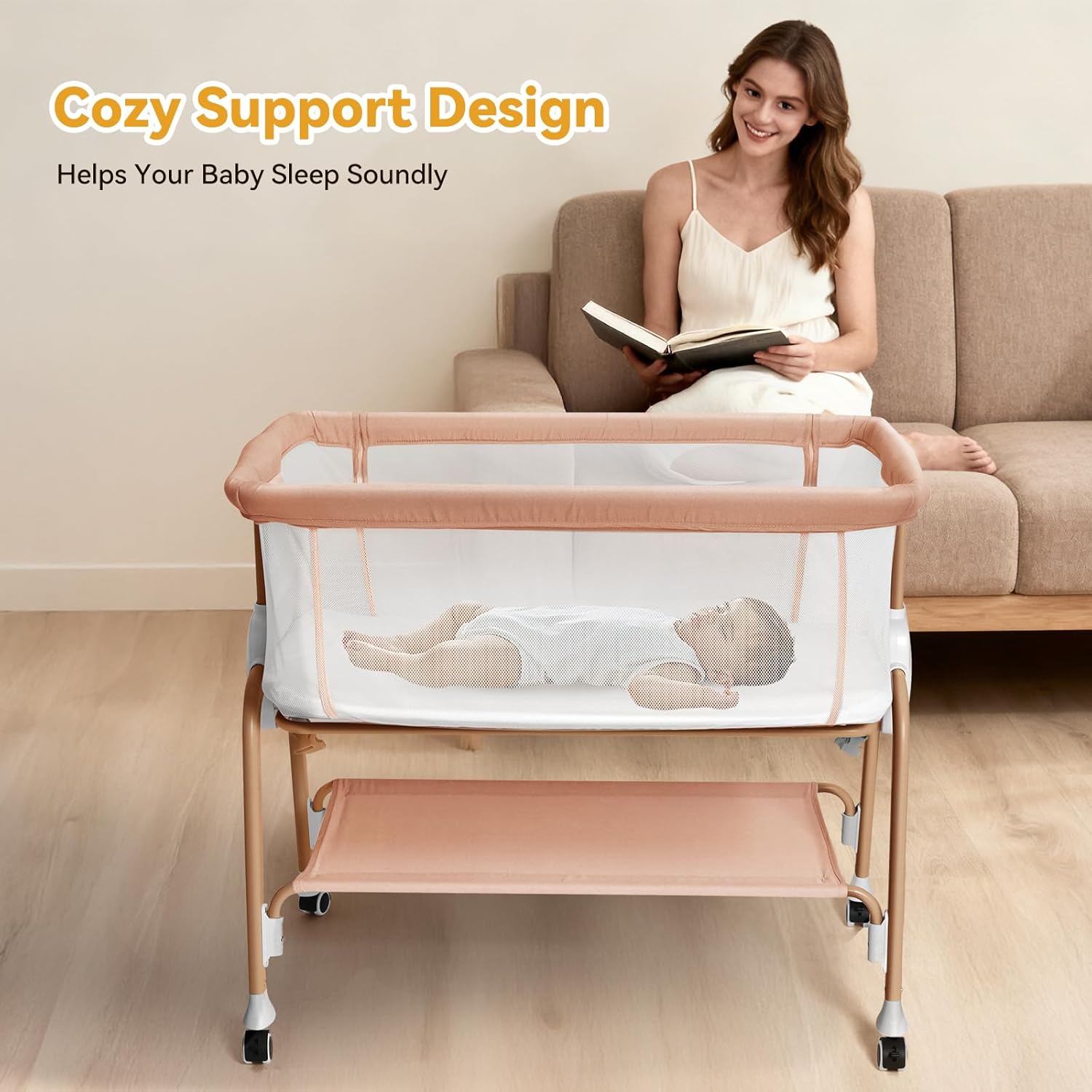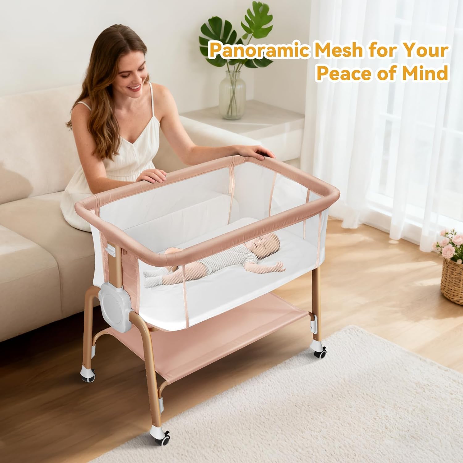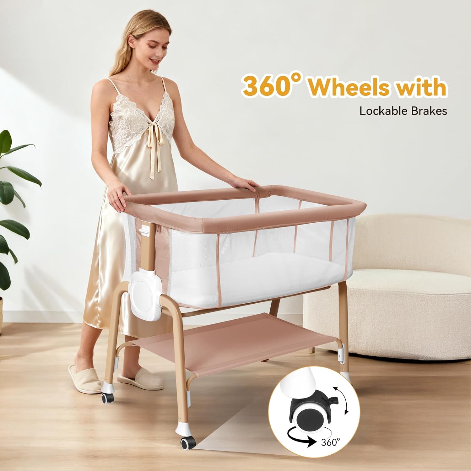Bassinet Bedside Sleeper, Bedside Bassinet for Newborn, Baby Bassinet with 5 Adjustable Height, Rocking Bassinet with Wheels, Breathable Mesh &Mattress, Easy Folding Portable Bedside Crib,Light Yellow