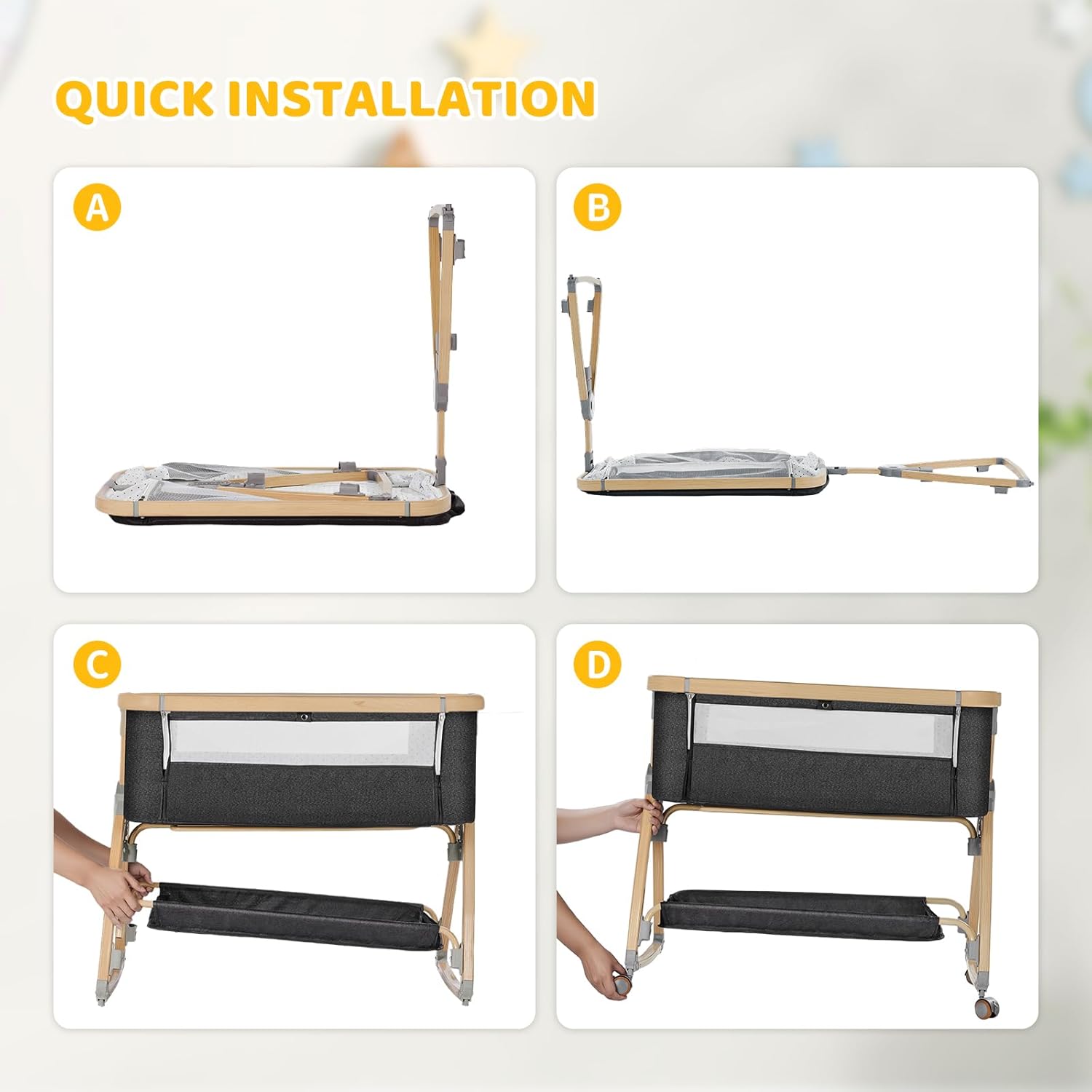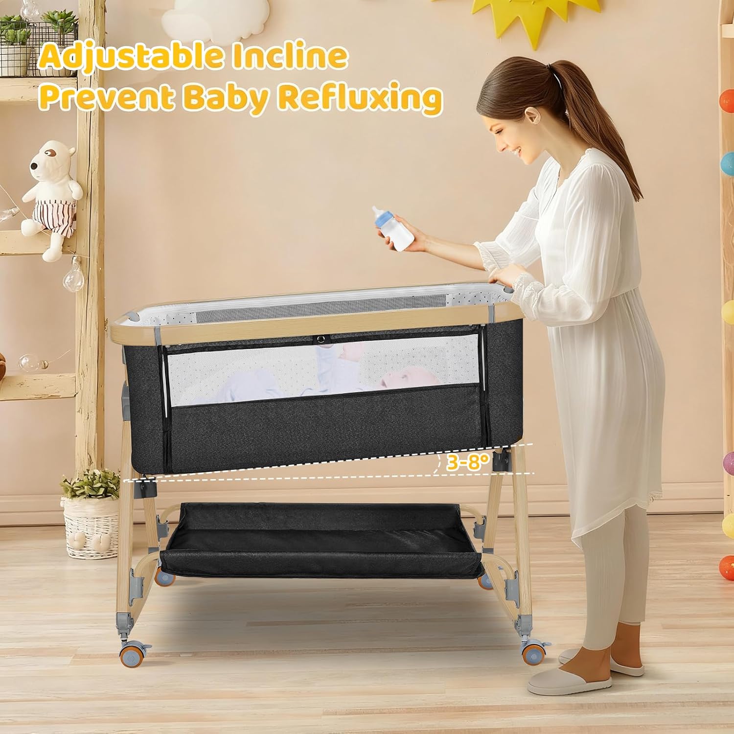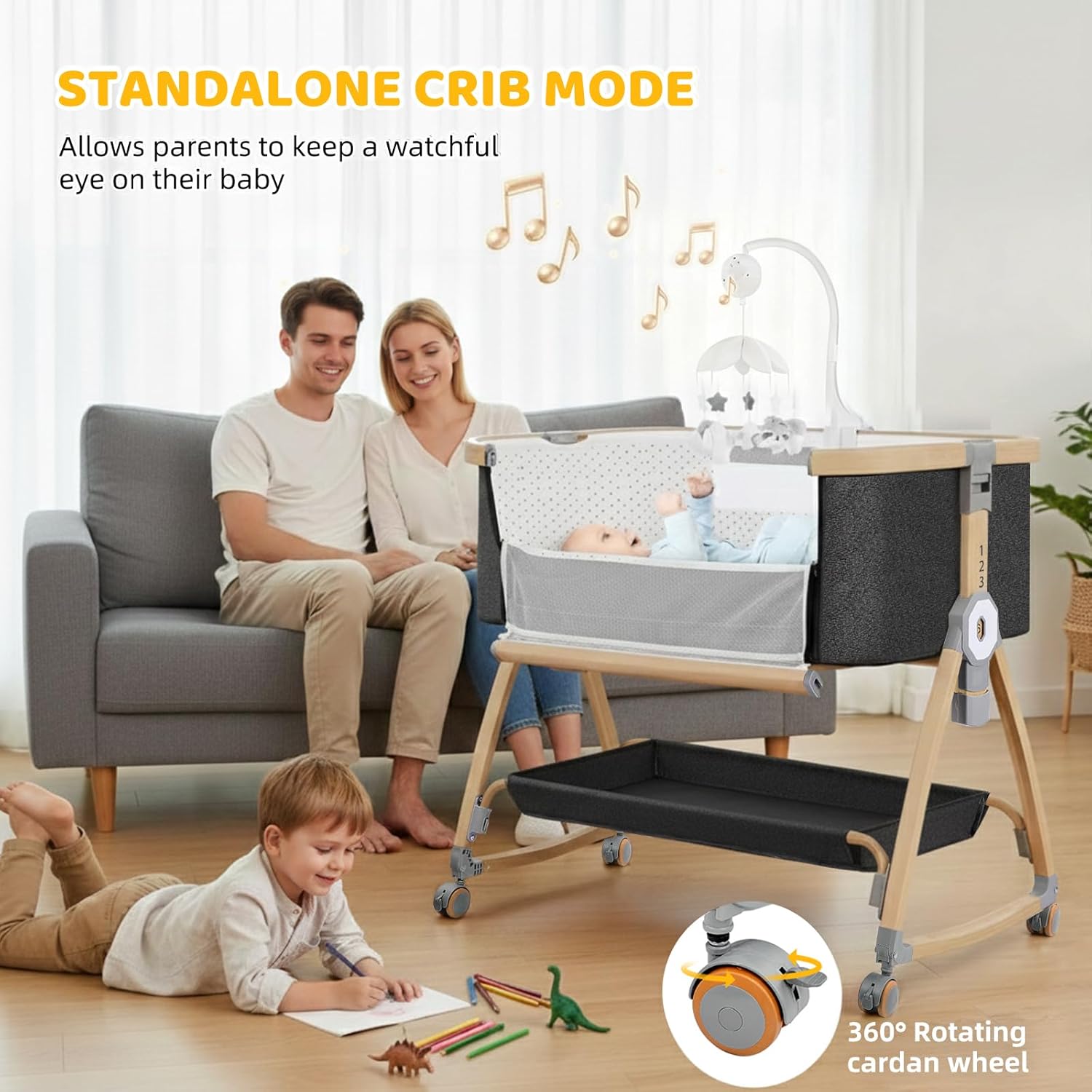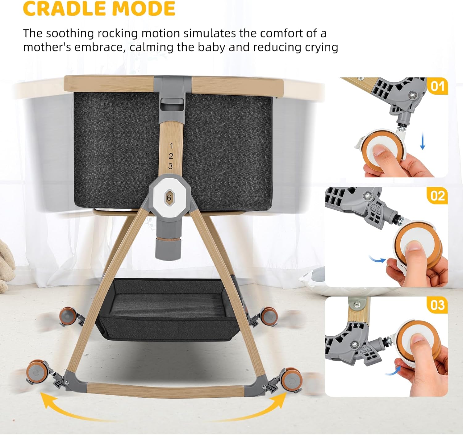 Bedside Bassinet,Bassinet Bedside Sleeper,Rocking Bassinet,3 in 1 Portable Bedside Crib with Mattress,Mobile,Mosquito Net,Storage Basket,6-Height Adjustable Bassinet with Wheels for Newborn,Deep Grey