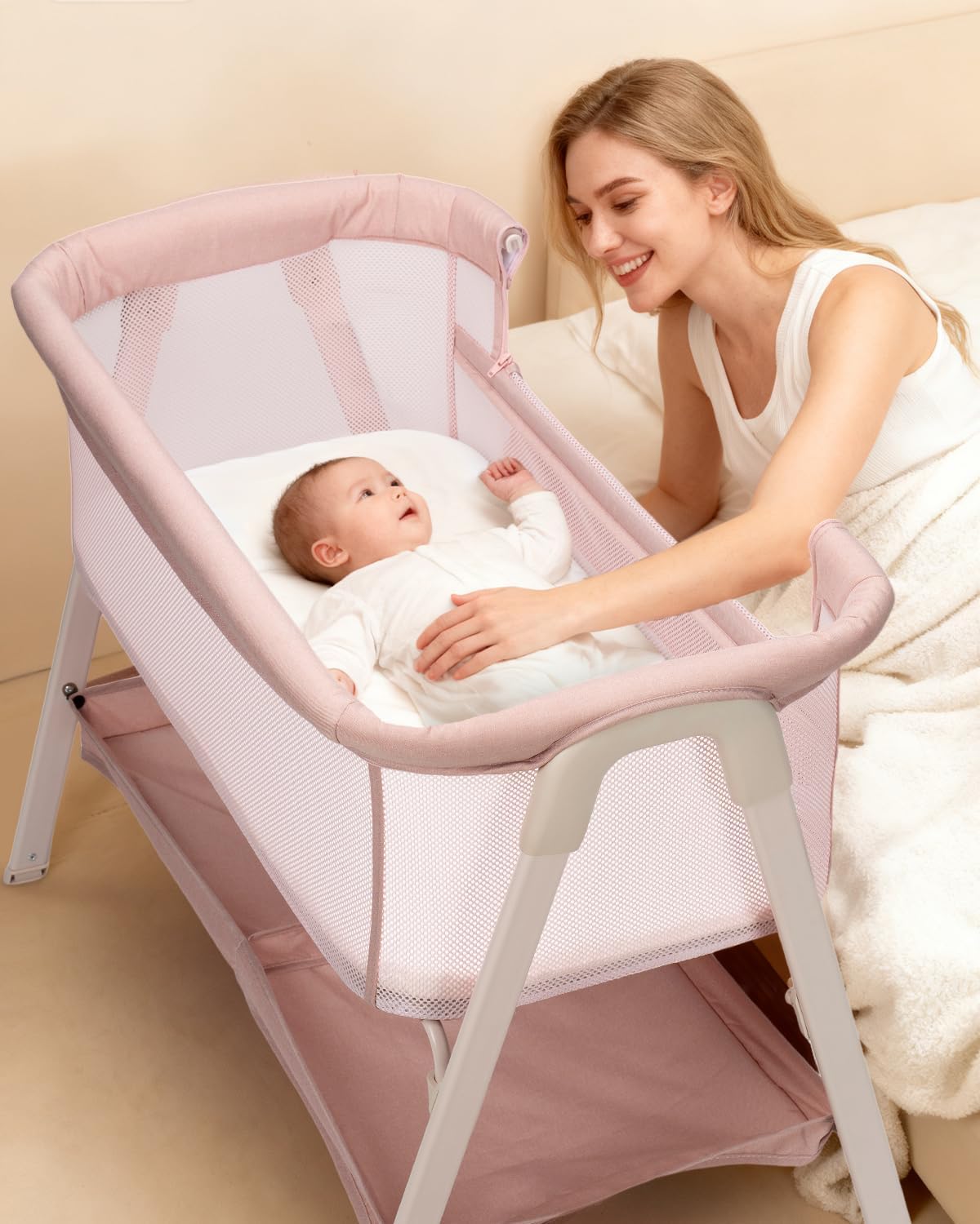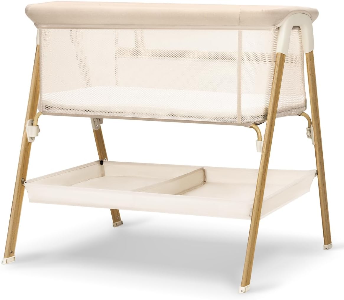 JevrJeur Baby Bassinet, Bedside Bassinet for Baby, Bassinet Bedside Sleeper with Mattress, Storage Basket and 4 Auto-Lock Wheels, Full-Mesh Sides, Bedside Mini Crib for Newborn (Beige)