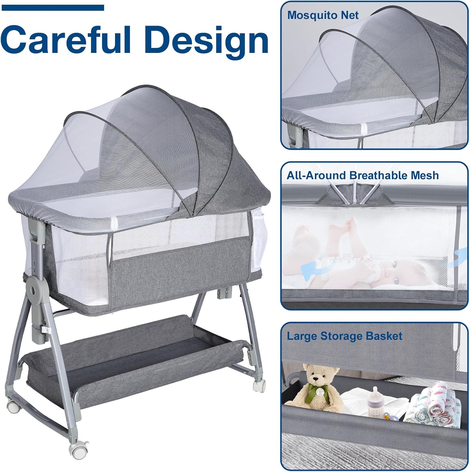 Jixrolyn 3 in 1 Baby Bassinet Bedside Sleeper, Height Adjustable Bedside Bassinet for Newborn and Infant with Mattress, Storage Basket, and Wheels (Grey)