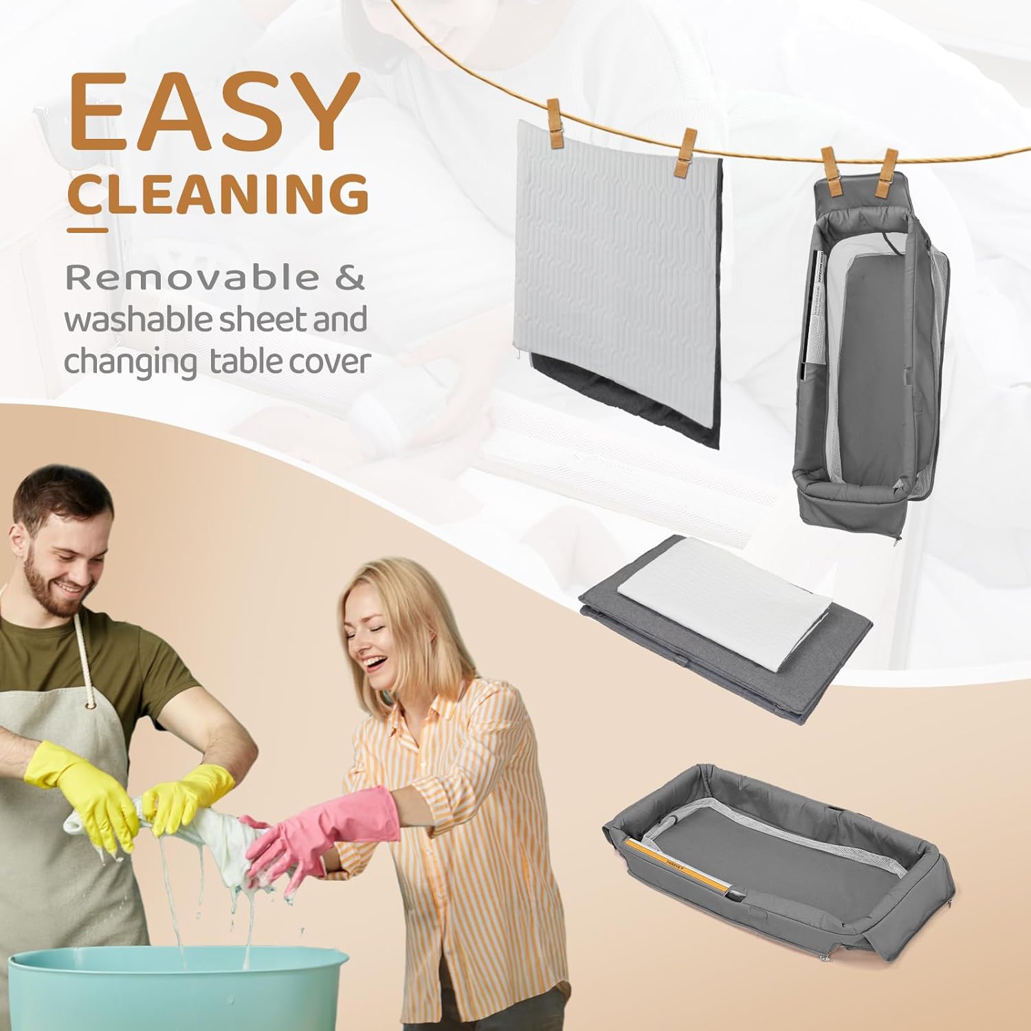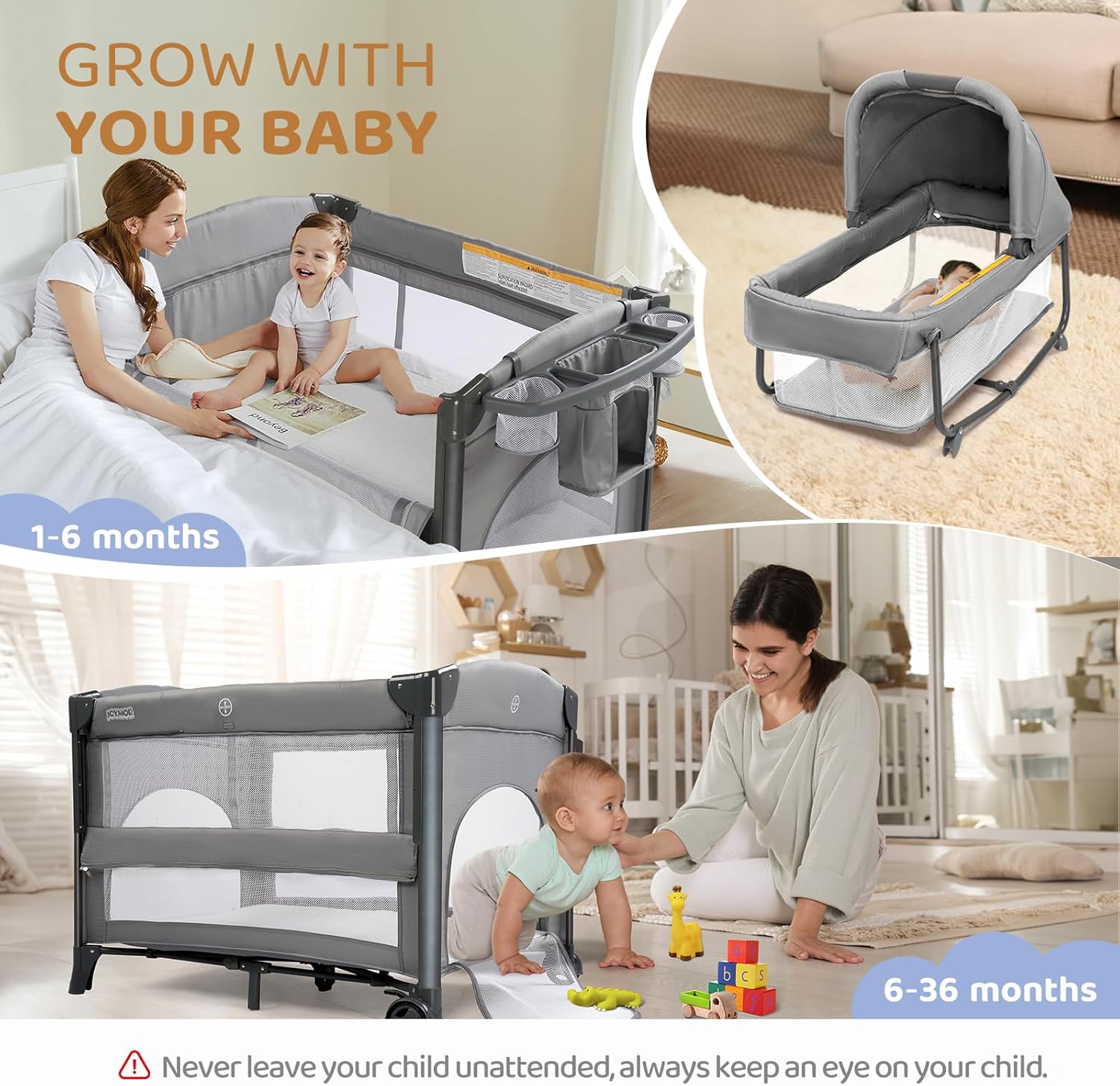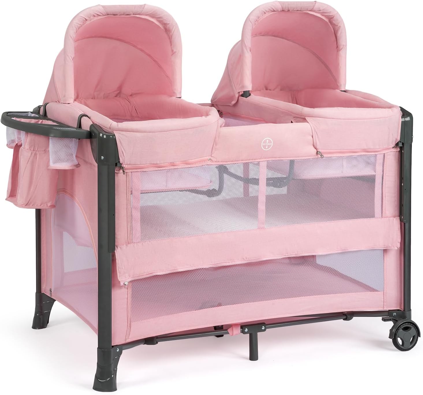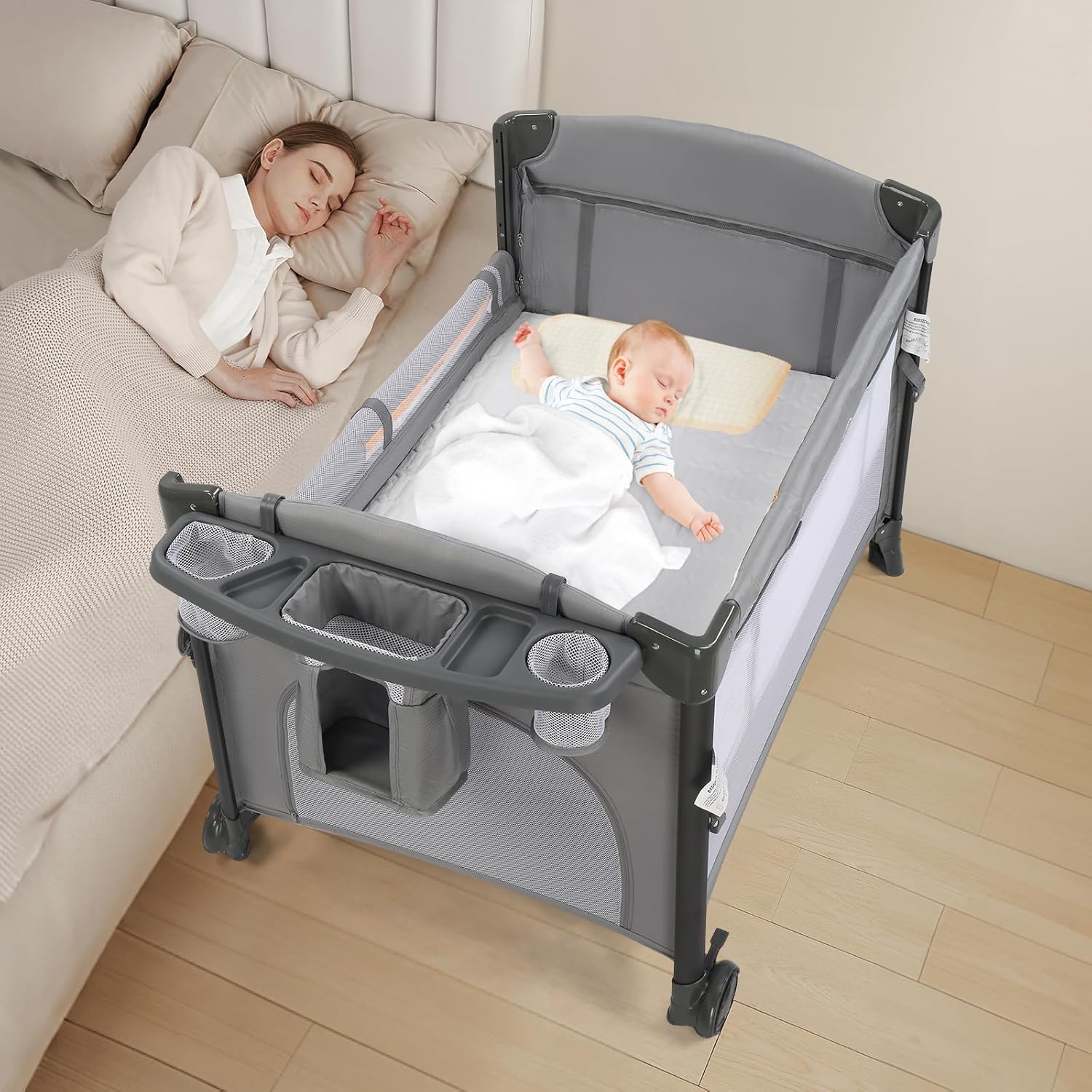 JOYMOR Twin Bassinet for Baby, Bedside Bassinet, Convertible to Bedside Sleeper and Playpen, with Wheel, Brake, Foldable Side Sleeper, Gray