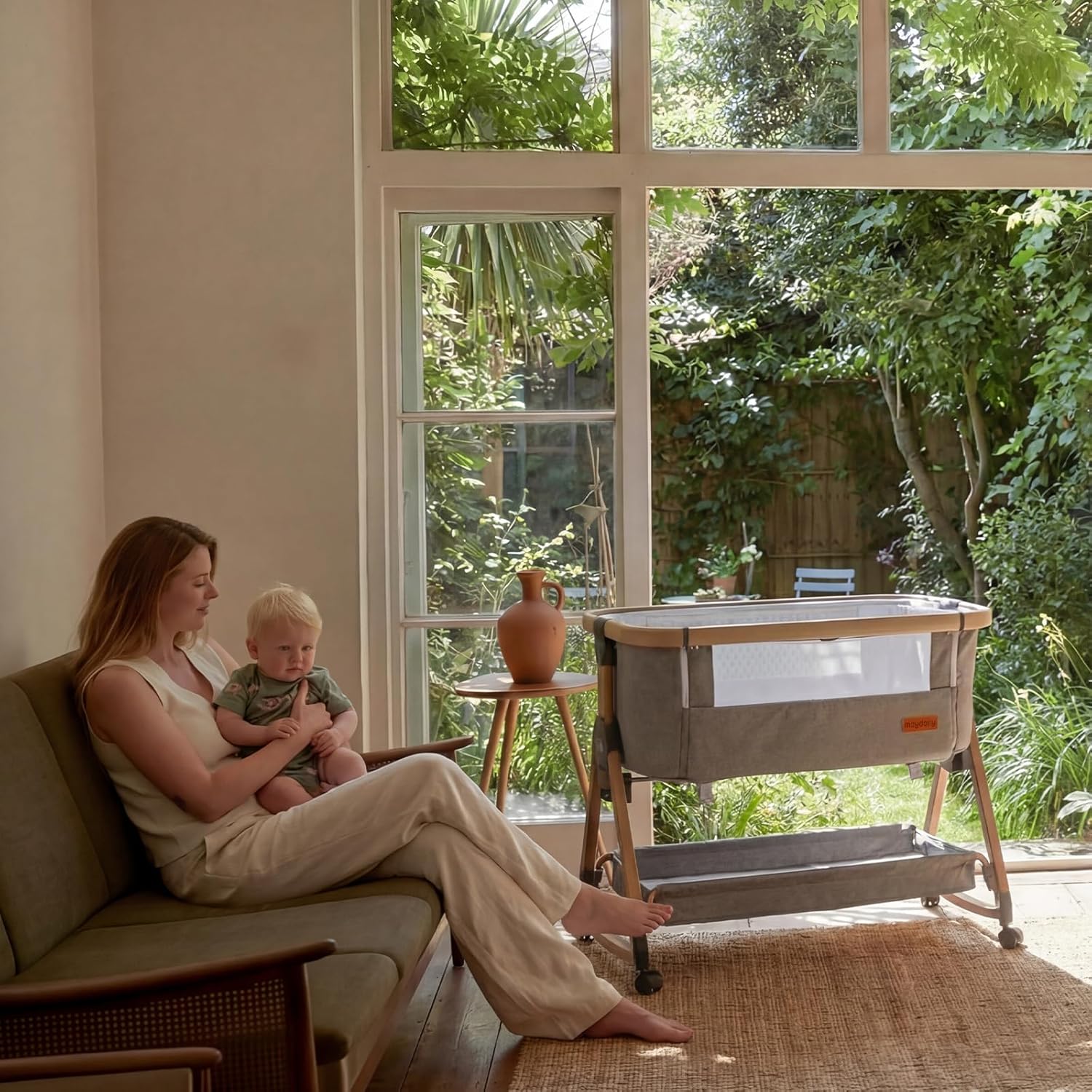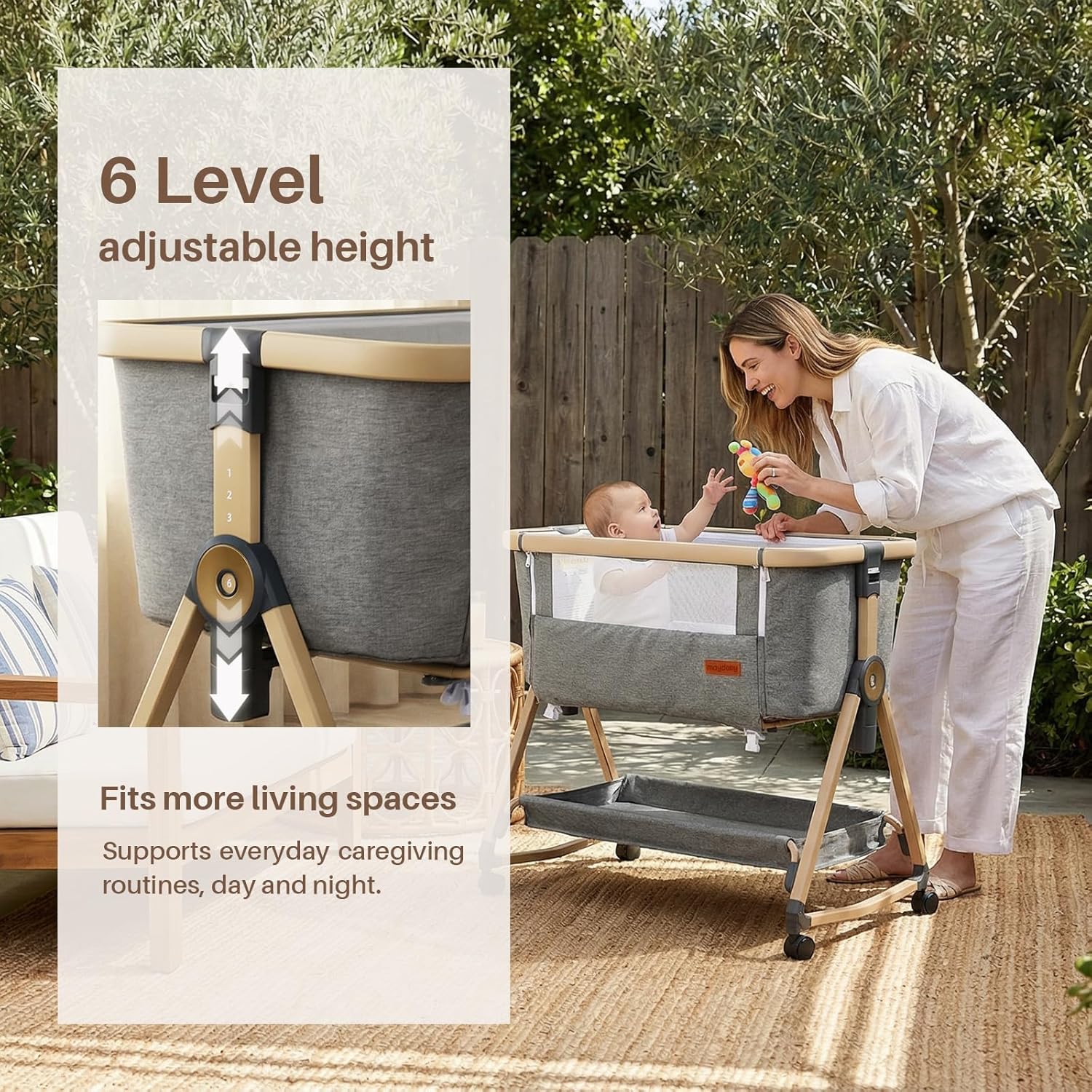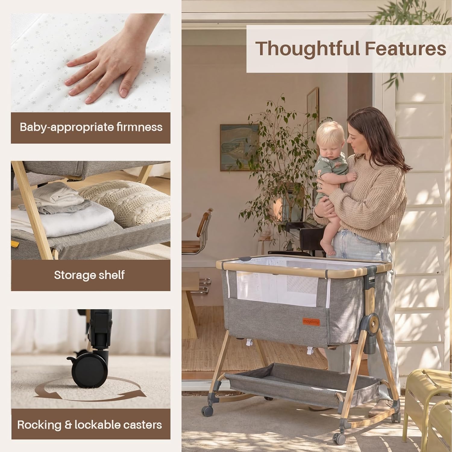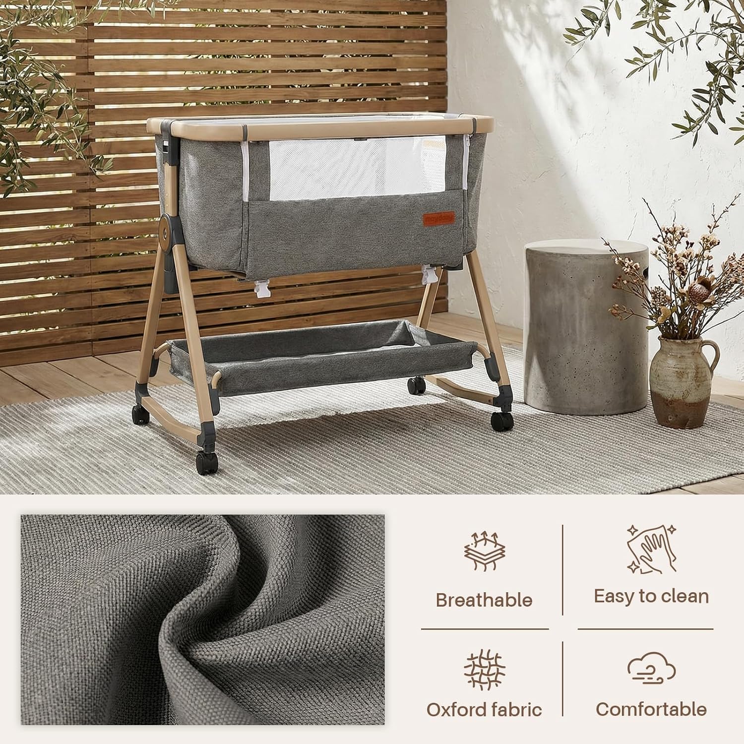 Maydolly Baby Bassinet & Bedside Sleeper, 3 in 1 Rocking Bassinet with Mattress & Sheet, Adjustable Height, Removable Breathable Cover, Easy Folding Infant Crib (Grey)