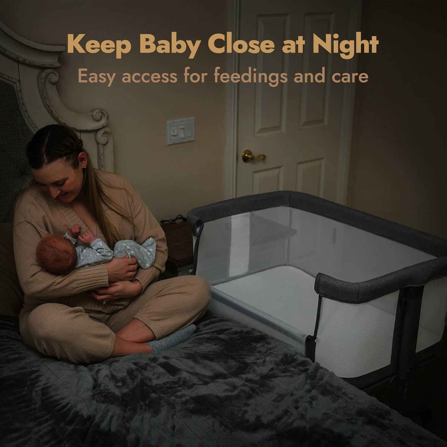 Papablic Baby Bassinet, Bedside Bassinet for Baby with Four-Sided Breathable Mesh & Soft Mattress, Adjustable Bassinet Bedside Sleeper with Storage Basket and Wheels, Easy to Assemble, Gray
