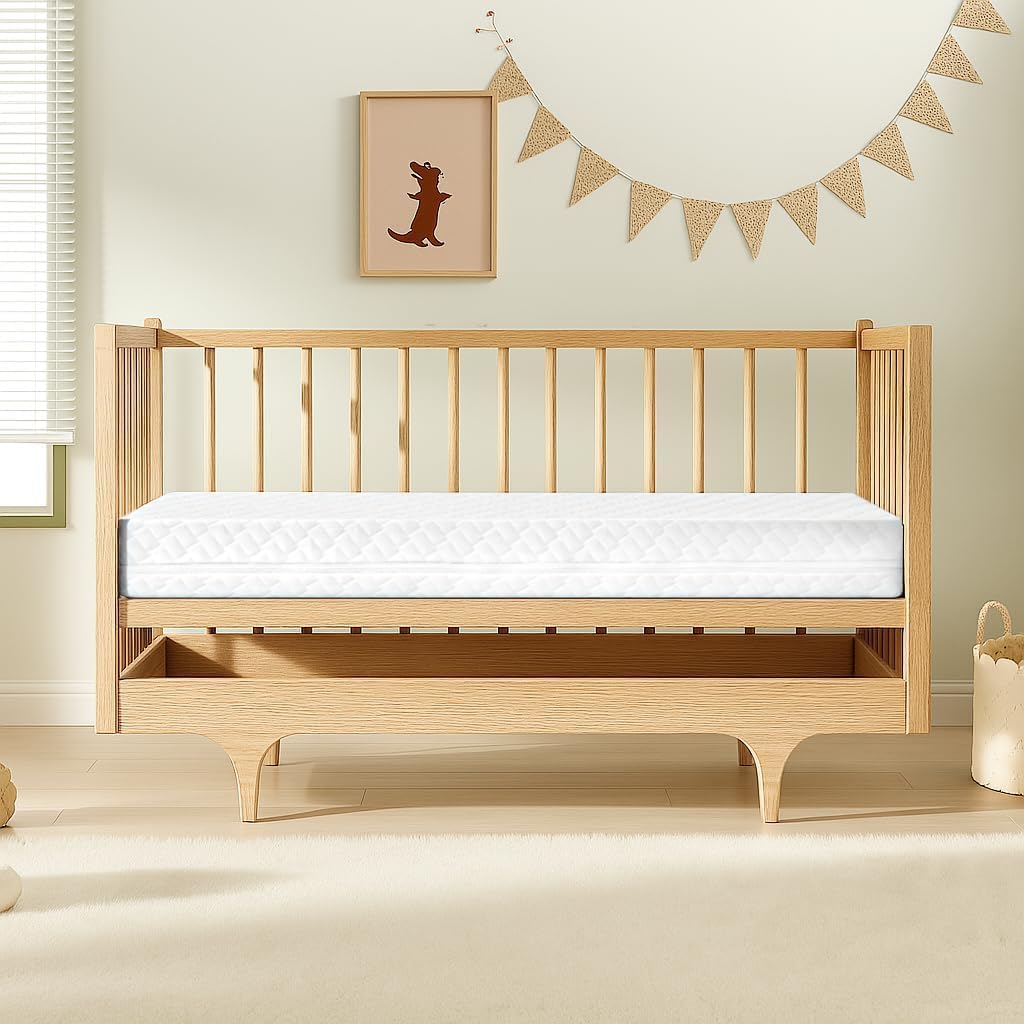 Dimensions of 52 x 28 x 5 inches, the mattress fits any standard crib, convertible crib and toddler bed.Doesn't have any glue, latex, or springs that these could be harmful over time.100% knitted hypoallergenic fabric,Non-Toxic -you can use it for many years.