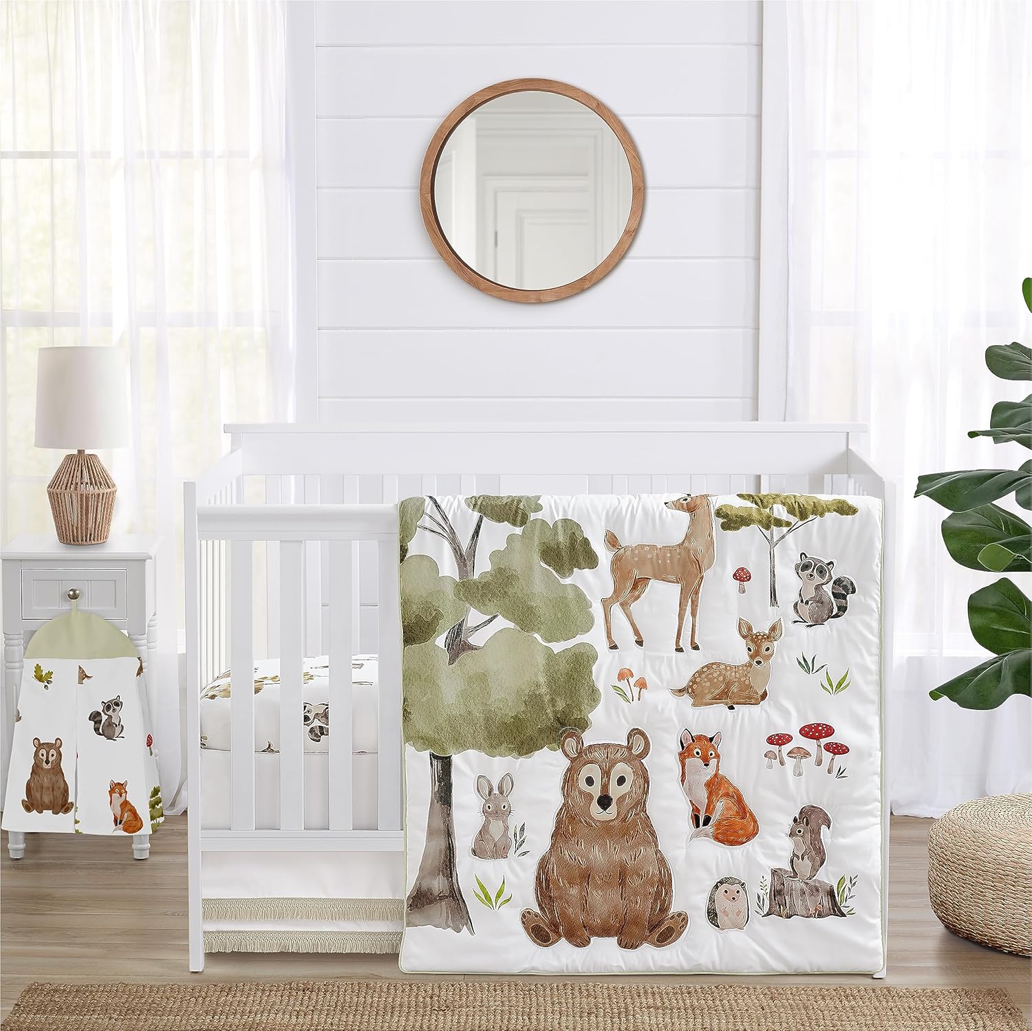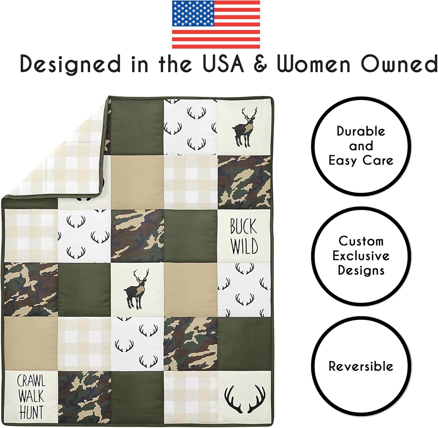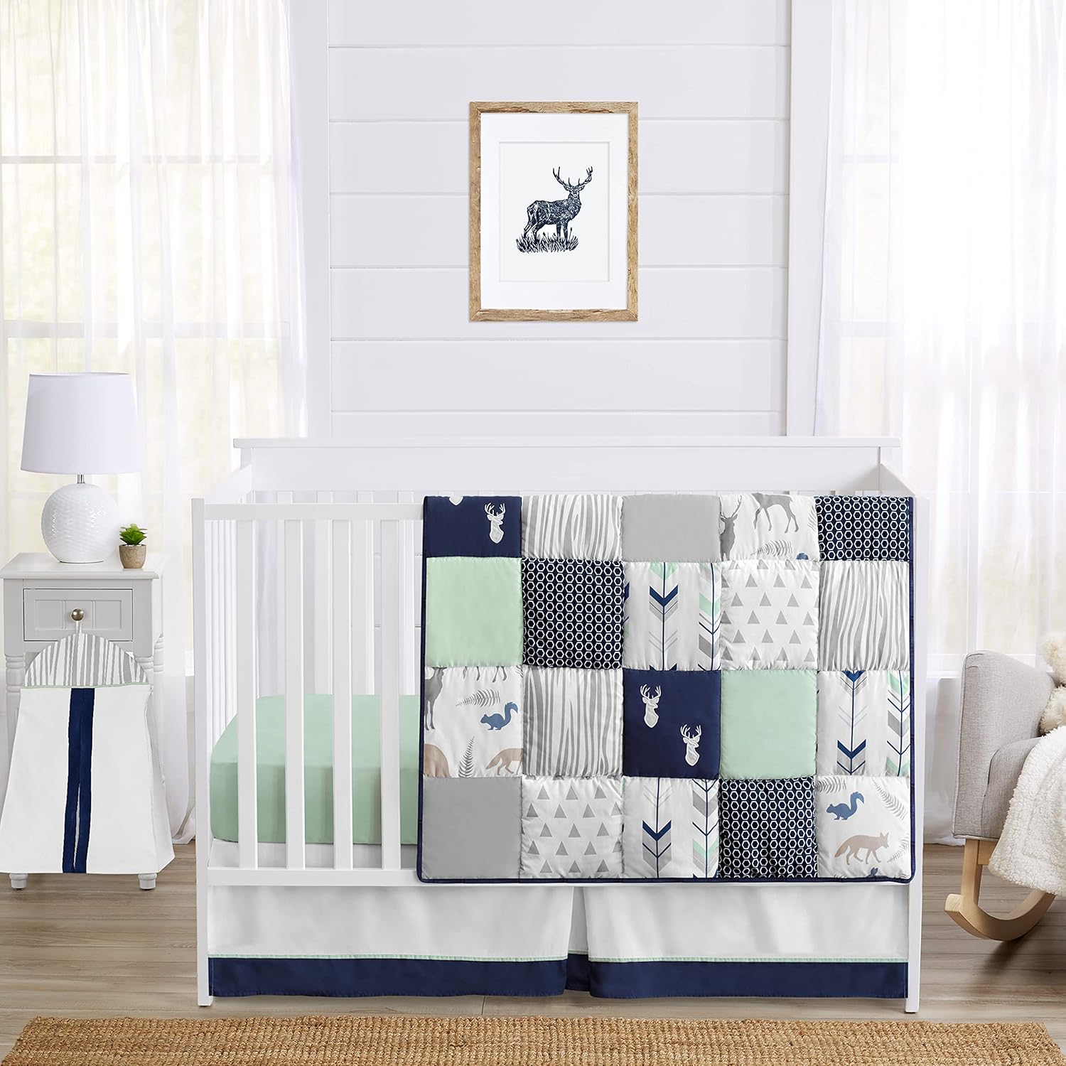 Sweet Jojo Designs 4-Piece Baby Crib Bedding Set (Woodland Camo Deer) for Boys, Infants/Nursery incl. Blanket, Fitted Sheet, Skirt, Diaper Stacker (Forest Green, Camouflage, Rustic, Stag, Beige Plaid)